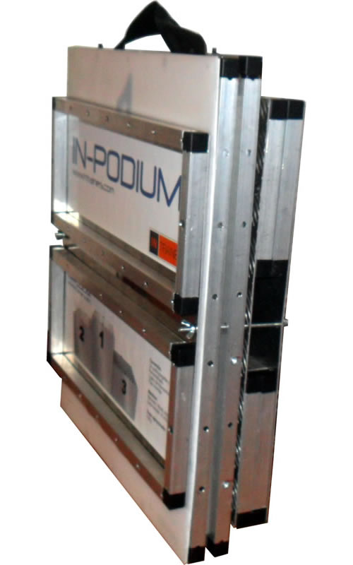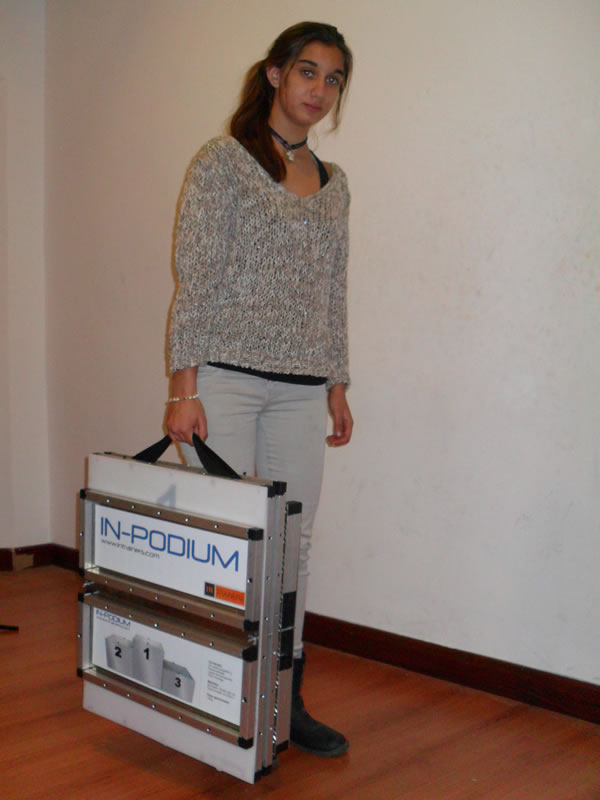 El pes de IN-Podium és de 14 Kg i la seva grandària, un cop desmuntat i embalat, és de les mesures d’ una maleta mitjana (63 x 52 x 14 cm.), el que fa que es pugui emmagatzemar en qualsevol lloc, sense ocupar gaire espai i sense deteriorar-se.