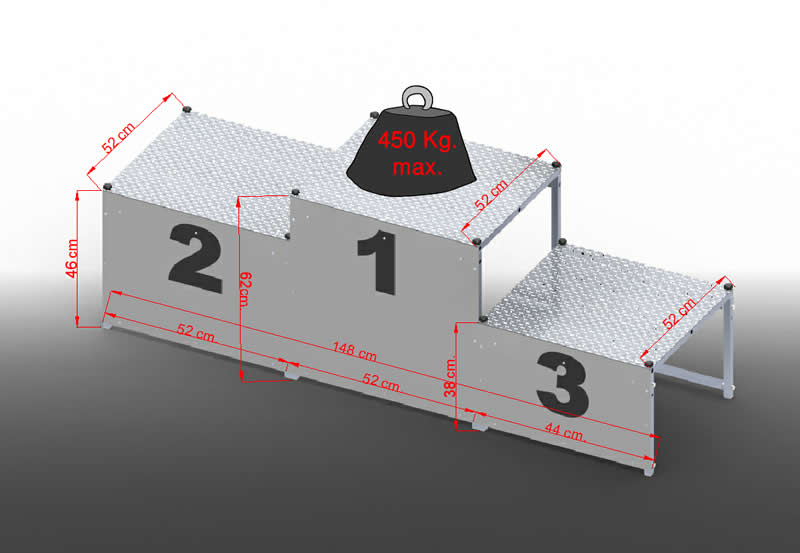 Es tracta d’un sistema modular realitzat en alumini, que permet a una sola persona transportar i muntar amb gran facilitat, un podi esportiu de grandària estàndard i en menys de 5 minuts.